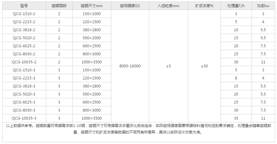 QCG型強輥濕式磁選機是我公司根據多年經驗和客戶現場需求研發的一種組合機型,可以實現多重結或不同磁場強度的組合。主要用于細粒弱磁性礦石的粗選、掃選和精選。可有效的對錳礦、赤鐵礦、假像赤鐵礦、鏡鐵礦、菱鐵礦、錳礦、鉻鐵礦針鐵礦、褐鐵礦、菱鐵礦、鉻鐵礦、鈮鉭鐵礦、鈦鈰鐵礦、黑鎢礦、鐵英巖礦、橄欖石、硫銅鍺礦、鐵白石、黑云母、綠簾石、蛇紋石、原生鈦鐵礦,海濱砂礦,原生金紅石,黑鎢礦和非金屬除鐵。