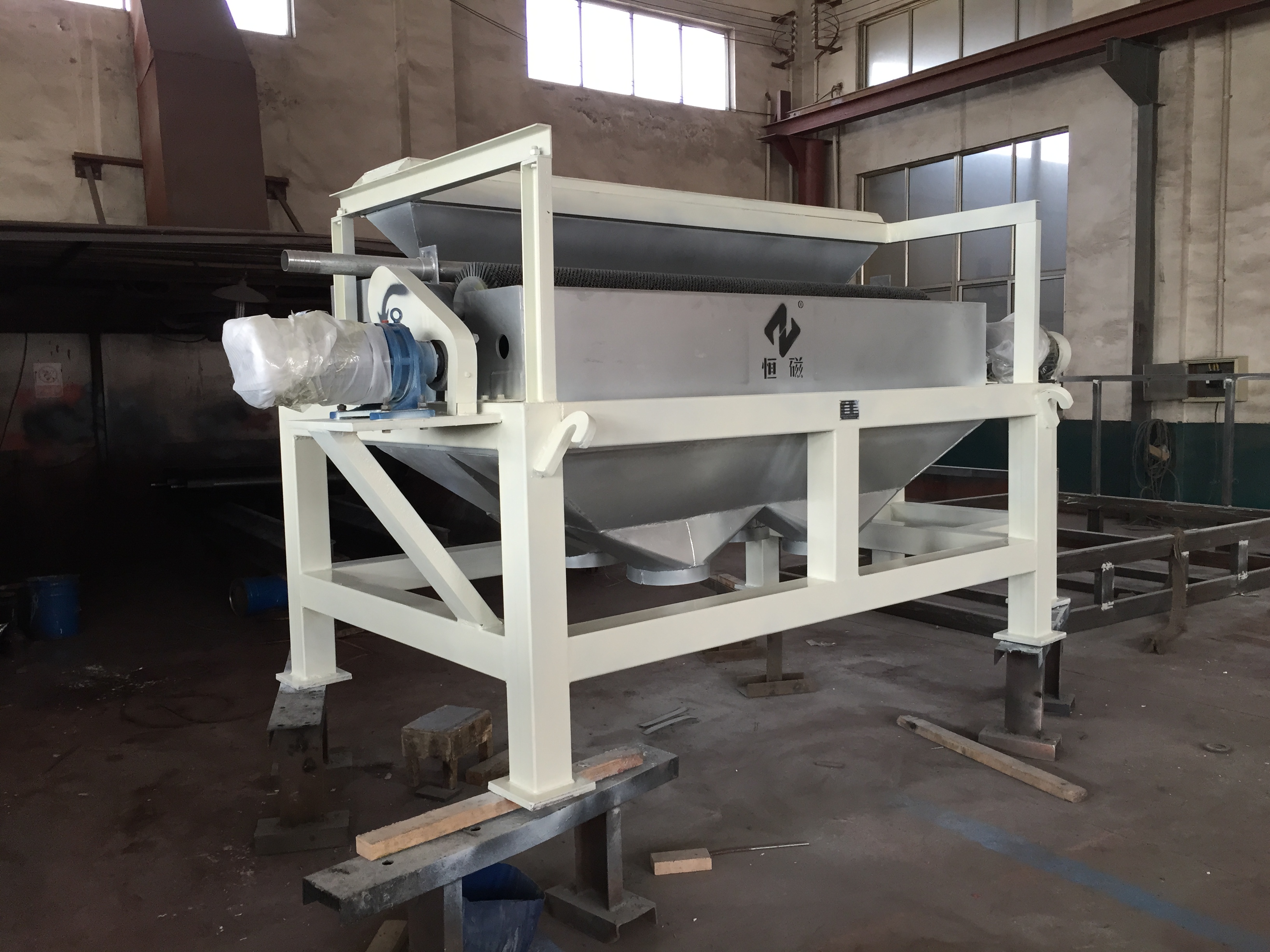 其原理為物料經料倉通過導料盤進入磁場區,磁性礦物被吸附在磁輥表面旋轉到達精礦區,毛刷將吸附在磁輥表面上的磁性礦刷脫,在高壓水的噴射下落到精礦斗里,部分未被吸附的磁性礦粒、非磁性礦粒和磁性較弱的礦粒進入到下一級再選。