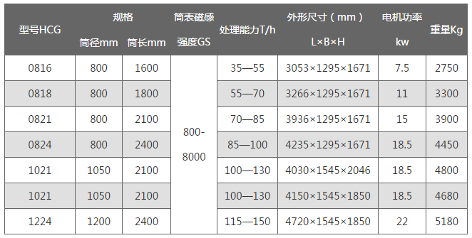 HCG干式磁選機(jī)技術(shù)參數(shù):