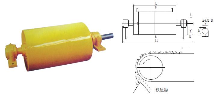 RCT型全磁滾筒與TD-75型、AD-80型通用固定式皮帶輸送機配套使用代替主動輪,也可與專用皮帶輸送機配套。